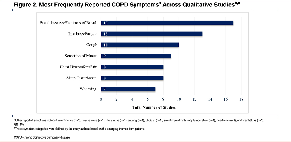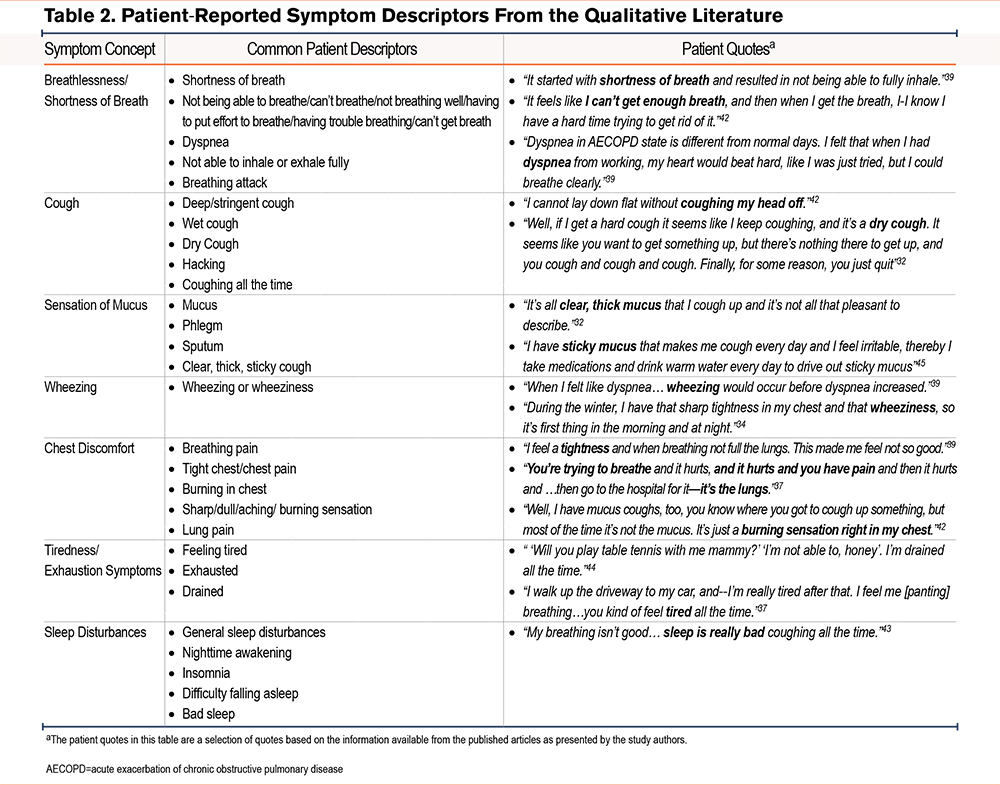 In COA research, there can be a misalignment between how researchers and patients understand health concepts. Although patient interviews are commonly used to inform the naming of these concepts, the final decision on terminology rests with the research teams. The challenge is that the label assigned to a health concept may not fully represent the language or terminology used by patients to describe their experience; patients’ knowledge of their disease also plays a critical role in the interpretation of health concepts.14 Measuring the wrong health concept in a trial risks negatively impacting the results, which is why involving patients early in the research process and drawing from high-quality patient-driven research is critical. In our metasynthesis, the final set of thematic labels was derived from specific words and phrases in patient quotes that were selected by researchers from the respective publications. Prominent symptoms identified in the metasynthesis include breathlessness/shortness of breath, cough, mucus, wheezing, chest discomfort, sleeping difficulty, tiredness, and weakness. Patients also described major effects on physical activity, emphasizing difficulties with regular activities of daily living. Emotional experiences included feelings of anxiety, frustration, and discouragement.