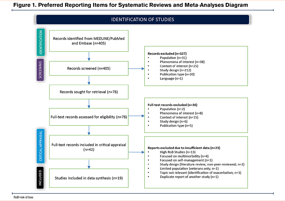 The inclusion criteria were based on the population, phenomenon of interest, context, and study design.17 The phenomenon of interest included patient-reported concepts (COPD symptoms and impacts, quality of life) as it pertained to disease experience. Qualitative research that included concept elicitation interviews, cognitive debriefing, focus groups, or mixed methods incorporating patient interviews was considered. Quantitative observational studies, randomized clinical trials, economic studies, and case studies were excluded. No restrictions were placed on the setting/country of the study. Titles and abstracts were independently screened by 2 researchers (CJM, AJ) using Nested Knowledge®.18 Relevant articles were further screened for full-text review, followed by critical appraisal (Supplement 2 in the online supplement).