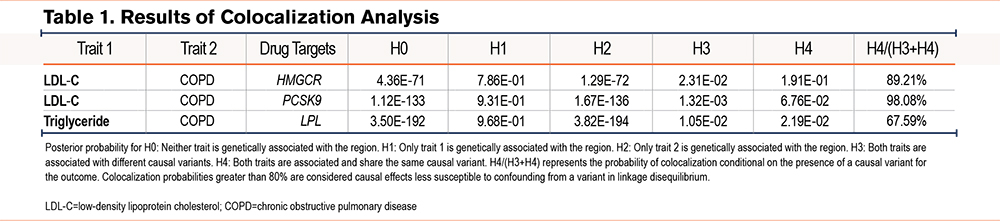 Further colocalization analyses revealed that the colocalization probabilities for LDL-C and COPD in the HMGCR and PCSK9 genes were 89.21% and 98.08%, respectively. These findings suggest that the effects of HMGCR and PCSK9 on COPD are unlikely to be confounded by a variant in LD. In contrast, the colocalization probability for triglycerides and COPD in the LPL gene was 67.59%, indicating that confounding by LD cannot be excluded (Table 1).