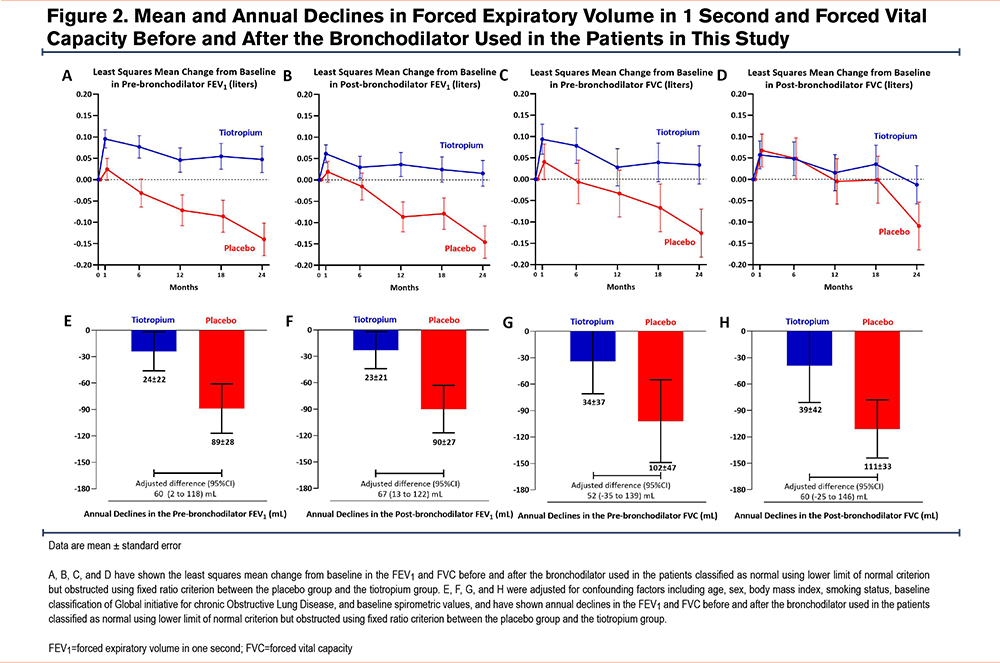 The secondary analysis revealed that tiotropium improved lung function, and reduced lung function decline, exacerbations, and chronic respiratory symptoms compared with placebo in patients diagnosed with airflow limitation according to the commonly used FR of 0.70 but not the LLN.