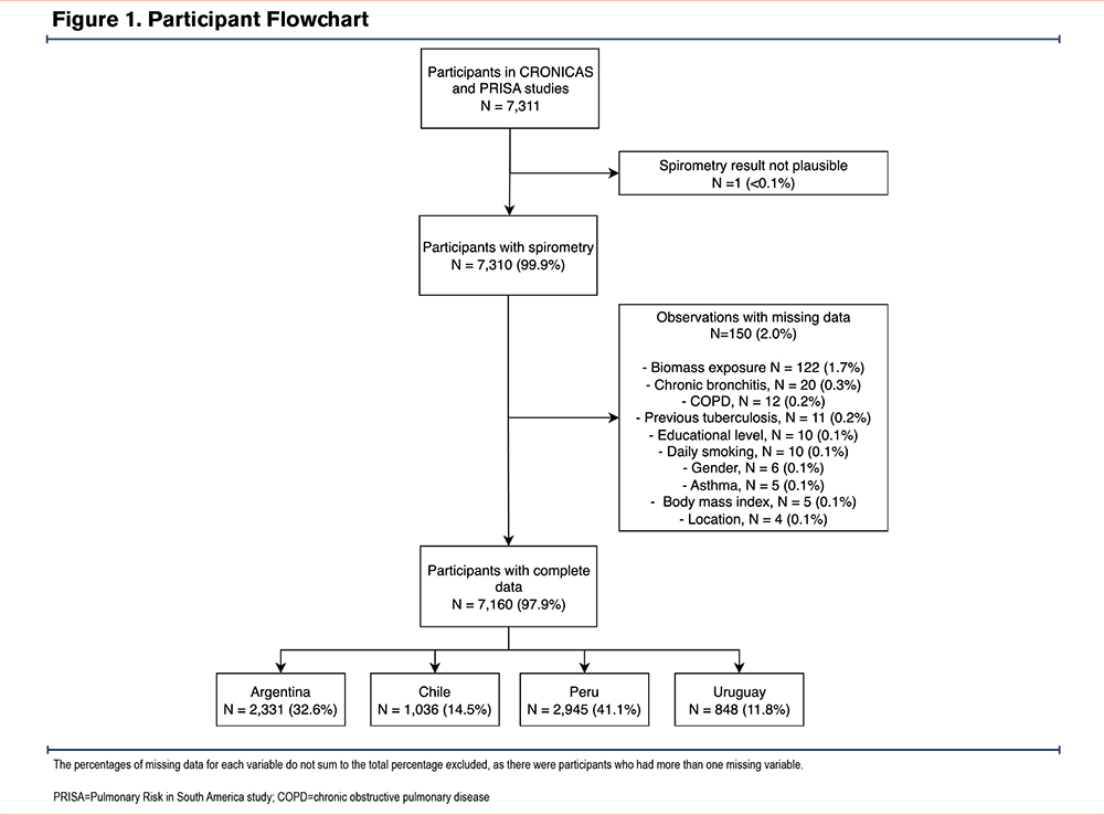 The original studies enrolled 7311 participants: 2957 from the CRONICAS study and 4354 from the PRISA study. One participant was excluded due to an implausible FEV1 value, and 150 participants (2.0%) were excluded due to missing data (Figure 1). The final sample included 7160 participants, representing 97.9% of the original cohort. The mean age was 57.3 ± 10.3 years, and 55.2% were men. A total of 23.7% had a BMI <25kg/m2, and 35.5% had a BMI ≥30kg/m2. In addition, 18.5% had a history of respiratory diseases.