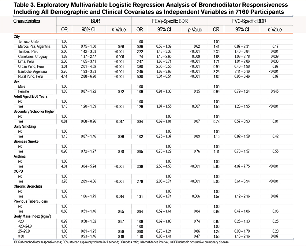 Abbreviations: ATS=American Thoracic Society; BDR=bronchodilator responsiveness; BMI=body mass index; CI=confidence interval; COPD=chronic obstructive pulmonary disease; FEV1=forced expiratory volume in 1 second; FVC=forced vital capacity; IL=interleukin; OR=odds ratio; PLATINO=Latin American Project for Research in Pulmonary Obstruction; PRISA=Pulmonary Risk in South America study; SD=standard deviation; WHO=World Health Organization