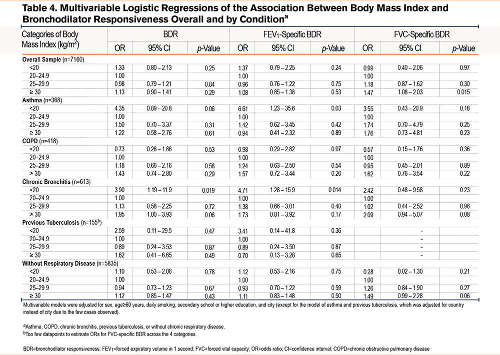 Our study also has some important strengths. We analyzed data from representative samples of multiple cities in 4 South American countries, considering diverse contexts of urbanization and altitude above sea level. Unlike previous research, our study addressed this association through a stratified approach that included both individuals with chronic respiratory disease and those without. To our knowledge, this is the first study to provide evidence of a possible association between BMI and BDR in a population without a prior diagnosis of chronic respiratory disease.