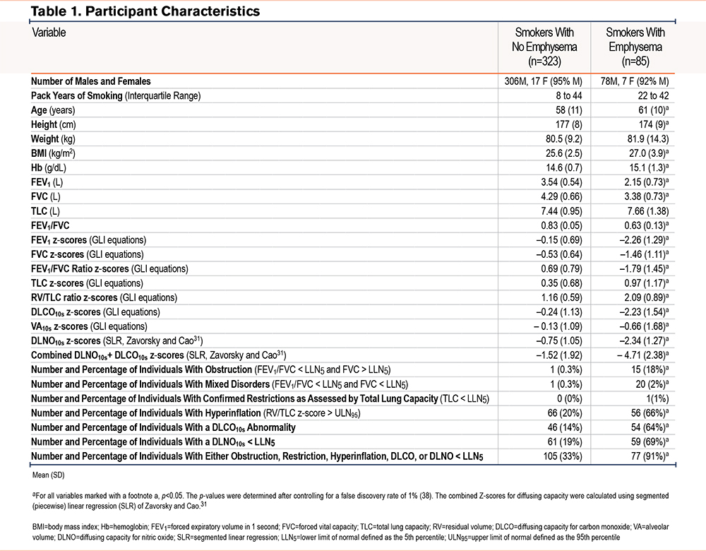 Of 496 eligible individuals, 408 (85 emphysema, 323 controls) met harmonization and quality control criteria (See Table S1, Figure S1 in the online supplement). Participant characteristics are presented in Table 1. The median breath-hold time for diffusing capacity was 10 seconds (interquartile range [IQR], 9.2–10). The median DLNO10s/DLCO10s ratio was 4.43 (IQR 4.09–4.88) for emphysema and 4.50 (IQR 4.22–4.84) for non-emphysema (p=0.226). Nearly all variables in Table 1 were statistically different between the 2 groups except for pack years of smoking and the proportion of participants with pulmonary restriction. The pooled data demonstrate that 71% of the variance in DLNO10s z-scores is shared with DLCO10s z-scores (Figure S2 in the online supplement).