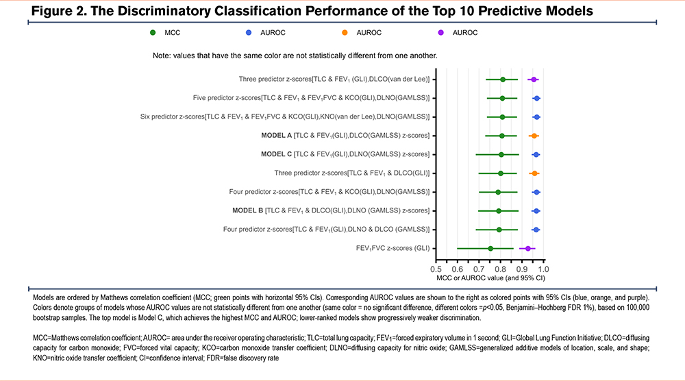 Figure 2 displays MCC (bars) and AUROC (points with 95% CIs) ranked by MCC at the Youden threshold for the top 17 models. The bottom 17 models are presented in Figure S5 in the online supplement. Three- to 6-predictor DLNO models achieve AUROC ≈0.96–0.97 with MCC ≈0.8. Model A (DLCO-based) is modestly worse, and Model B (A + DLNO) trades sensitivity and specificity without clear net gain (for fold-averaged metrics and CIs).