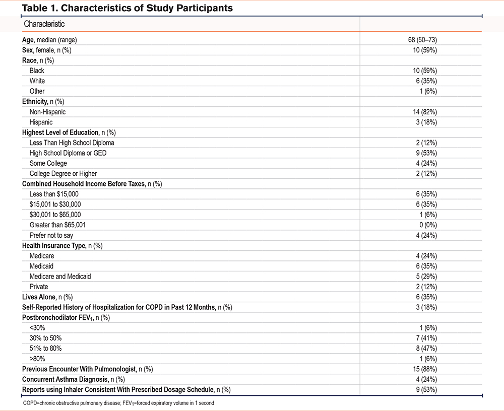 Less than 50% of patients with chronic obstructive pulmonary disease (COPD) are adherent to inhaled long-acting bronchodilators and corticosteroids despite the known efficacy of these medications.1-3 Nonadherence to COPD medications is linked to poorer quality of life, higher health care costs, and greater risk of hospitalization and death.4-6 Studies suggest that minority race and lower socioeconomic status (SES), among other factors, are associated with nonadherence.7-9