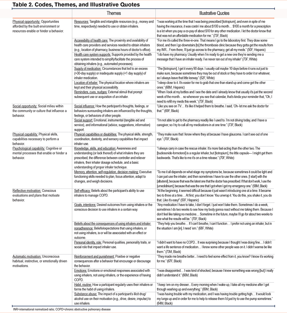 Thematic analysis of interview transcripts took place concurrently with data collection. Three investigators (SL, AP, EO) developed a preliminary codebook using 4 exemplar interviews selected for their depth and breadth of themes. The preliminary codes were largely based on the domains of the TDF with additional codes generated to capture more nuanced aspects of inhaler use behavior identified in the interviews. Two investigators (SL, EO) independently coded these interviews, meeting regularly with a third investigator (LS) to compare coding and refine code definitions. After reviewing 9 additional interviews for emerging themes, the coding team reached a shared understanding of the codes and finalized the codebook (Supplemental Appendix in im the online supplement). Two investigators (SL, EO) independently coded the remaining interviews using NVivo (version 14, Lumivero; Denver, Colorado), met regularly to compare codes and reconcile discrepancies, and consulted with an expert reviewer (LS) to reach consensus.