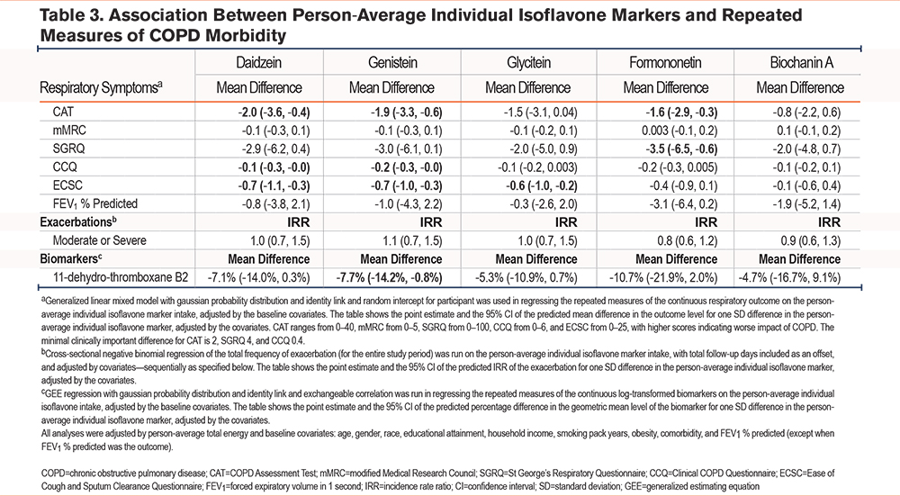 Notably, isoflavone intake was not significantly associated with the mMRC or prospective exacerbation rates. The mean difference in the mMRC was towards improvement in dyspnea, so it is possible that the current study was underpowered to detect a significant difference. On the other hand, since the mMRC is a measure specifically of dyspnea, the proposed anti-inflammatory and antiplatelet mechanisms of isoflavone intake may impact respiratory morbidity primarily through improved of cough and sputum production rather than through dyspnea. Regarding exacerbations, it is possible that the effect of isoflavone intake on respiratory morbidity can modify day-to-day symptoms, but that the associated anti-inflammatory and antiplatelet effects are too modest to modify the course of an exacerbation triggered by a respiratory infection or significant environmental exposure.