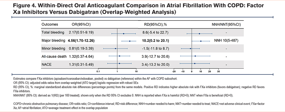 In the AF with comorbid COPD population restricted to DOAC, an overlap-weighted model with adjustment for residually imbalanced covariates compared FXa inhibitors (apixaban/rivaroxaban/edoxaban) versus dabigatran. Major bleeding was significantly higher with FXa inhibitors (OR, 4.56; 95% CI, 1.70–12.26; RD, 10.2%; 95% CI, 0.2%–20.1%), corresponding to an NNH of 10 (95% CI, 5–487). Total bleeding trended higher but was not significant (OR, 2.17; 95% CI, 0.51–9.19; RD, 8.6%; 95% CI, -5.4% to 22.7%). Minor bleeding, all-cause death, and NACE did not differ significantly (ORs 0.81, 1.32, and 1.31, respectively; corresponding RDs -1.5%, +3.9%, and +3.4%, with 95% CIs spanning the null). Detailed ORs and RDs are presented in Figure 4, and overlap-weighted event counts and ARs are shown in Supplementary Table 10 in the online supplement.