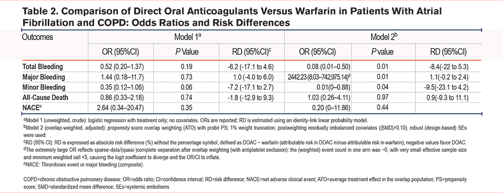 In patients with AF and COPD, the OW-adjusted primary analysis (Model 2) showed that, compared with warfarin, DOACs were associated with a lower risk of total bleeding (OR, 0.08; 95% CI, 0.01–0.50; RD, -8.4%; 95% CI, -22.0% to -5.3%). Minor bleeding was likewise reduced (OR 0.01; RD, -9.5%; 95% CI, -23.1% to -4.5%), although the CIs were wide. Estimates for major bleeding were unstable because of sparse data (near-zero weighted events in the treatment arm); the overlap-weighted event counts are provided in Supplementary Table 7 in the online supplement. The RD for major bleeding was close to zero, with CIs crossing the null. No clear differences were observed for all-cause death or NACE.