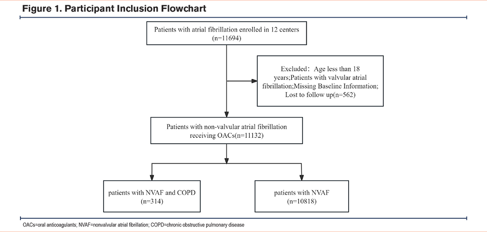 From January 2016 to December 2020, we conducted a retrospective cohort study across 12 centers in China to analyze the risks of bleeding and all-cause death in patients with AF and COPD who were treated with different oral anticoagulants, the list of multicenter hospitals is provided in Supplementary Table 1 in the online supplement. The institutional review board of Fujian Maternal and Child Health Hospital approved the protocol (Registration No.: ChiCTR 2300067734). As the study was retrospective, the institutional review board waived the requirement for patient informed consent. The inclusion criteria for the study were patients diagnosed with AF, and patients currently receiving treatment with warfarin or DOACs (including dabigatran, rivaroxaban, apixaban, and edoxaban). The exclusion criteria were: (1) patients with valvular AF, (2) patients aged ≤18 years, (3) missing baseline information, and (4) loss to follow-up. Ultimately, 11,132 patients receiving oral anticoagulant therapy for AF were included in this study, with an average follow-up period of about 13 months. The flowchart of participant inclusion is shown in Figure 1. These patients were divided into 2 subgroups: patients with AF and concomitant COPD (n=314) and patients with AF without COPD (n=10,818).