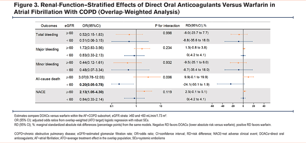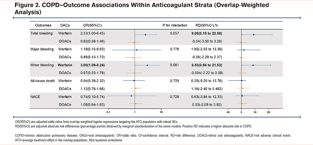 In the overlap-weighted primary analysis stratified by anticoagulation strategy (warfarin versus DOACs), COPD was associated with a higher bleeding risk among patients treated with warfarin: total bleeding OR 2.53 (95% CI, 1.00–6.45), corresponding RD 9.05% (95% CI, 0.15%–22.50%); minor bleeding OR 3.00 (1.09–8.24), RD 8.53% (0.56%–21.53%). In the DOAC group, these associations were not significant. No significant associations were observed for major bleeding, all-cause death, or NACE in either anticoagulation stratum. The treatment-by-disease interaction was borderline and not statistically significant for total bleeding (P=0.057) and minor bleeding (P=0.061) (Figure 2). Overlap-weighted event counts and absolute risks are shown in Supplementary Table 4 in the online supplement.