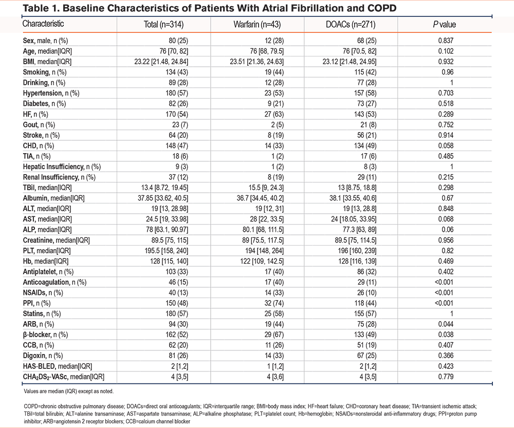 The baseline characteristics of AF patients on anticoagulant therapy, with and without COPD, are shown in Supplementary Table 2 in the online supplement. Compared with the AF-only group (n=10,818), the AF with comorbid COPD group (n=314) was older, had a higher proportion of men, and a lower BMI; it also carried a greater comorbidity burden, with heart failure, coronary artery disease, and prior stroke being more common. Overall use of oral anticoagulation was significantly lower. In laboratory indices, total bilirubin, alanine aminotransferase, and aspartate aminotransferase were lower, whereas serum creatinine was higher; platelet counts did not differ significantly. Regarding medications, use of digoxin and nonsteroidal anti-inflammatory drugs (NSAIDs) was more frequent, whereas β-blockers and calcium channel blockers were used less often; the use of antiplatelet agents, statins, and angiotensin 2 receptor blockers (ARBs) was similar. Risk scores (HAS-BLED and CHA2DS2-VASc) were higher. Except for smoking status and platelet count, most between-group differences were statistically significant (p<0.05). Within the COPD group, baseline characteristics between patients treated with warfarin (43 patients) and direct oral anticoagulant (271 patients) were compared among a total of 314 patients (Table 1). No differences were found between the 2 subgroups in terms of gender, age, BMI, smoking, other comorbidities, laboratory indicators, bleeding risk (HAS-BLED score), and stroke risk (CHA2DS2-VASc score). In terms of concomitant medication, compared to the warfarin group, patients on DOACs were more likely to also receive anticoagulants, NSAIDs, PPIs, ARBs, and β-blockers, with statistically significant differences (p <0.05). Event counts for the full cohort, stratified by anticoagulant, are shown in Supplementary Table 3 in the online supplement.